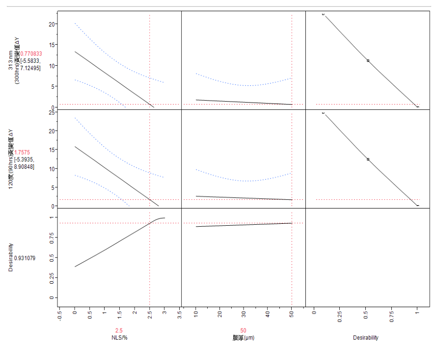 2.3.3 反应曲面(Response Surface Methodology) (RSM)探讨新型耐UV/耐热剂(NHS)与膜厚耐候影响分析