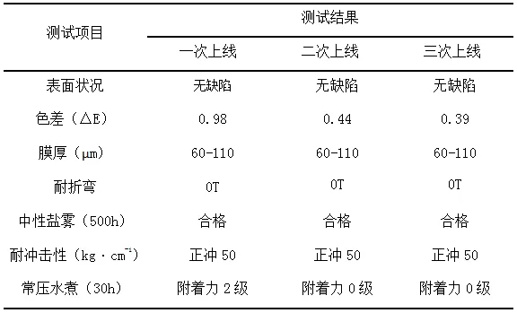第一次工业级实验色差方面(△E=0.98)出现黄变现象(如图3g),使涂层色差接近临界值(△E≤1.0),与中试前期内部测定值(△E=0.3)有较大的差异,可能原因为实验室固化使用的烘箱与生产线固化炉加热方式不同,固化炉加热方式为天然气燃烧供热,会产生氮氧化物等副产物,使涂层发生黄变[4]。针对黄变问题的改进方案为在配方中加入0.5%抗氧剂,抗氧剂可以捕捉涂层中聚合物氧化产生的自由基,减少其引起的氧化反应,降低黄变现象,配方改进后进行的第二、三次工业级实验黄变问题得到了大幅改善,总色差分别为0.44和0.50(如图3h和3i)。