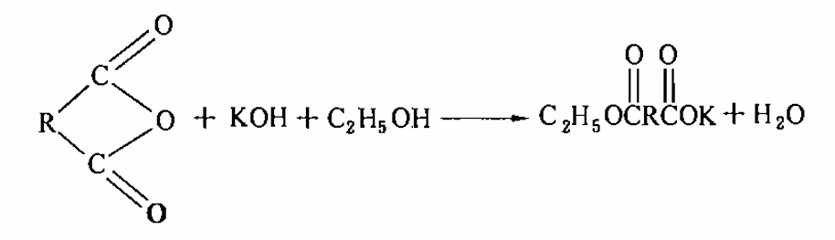 称取一定质量的树脂,溶解在含水的混合溶剂中。先让游离酸酐水解20 min,然后用电位滴定法将氢氧化钾乙醇标准滴定溶液滴加到该溶液中,反应如下: