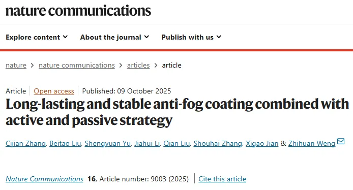 相关论文以“结合主动和被动策略的持久稳定的防雾涂层”发表在《Nature Communications》上。