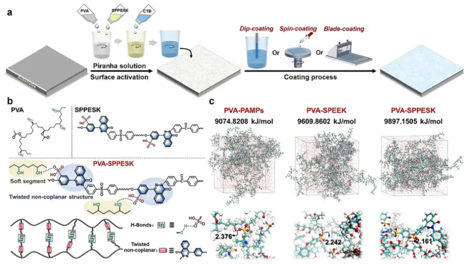 图1 | a. PVA-SPPESK-CTB涂层的制备示意图。 b. PVA-SPPESK强氢键交联系统的合成示意图。 c. 通过分子动力学模拟比较PVA-PAMPs、PVA-SPEEK和PVA-SPPESK氢键交联系统的内聚能与氢键类型及键长。