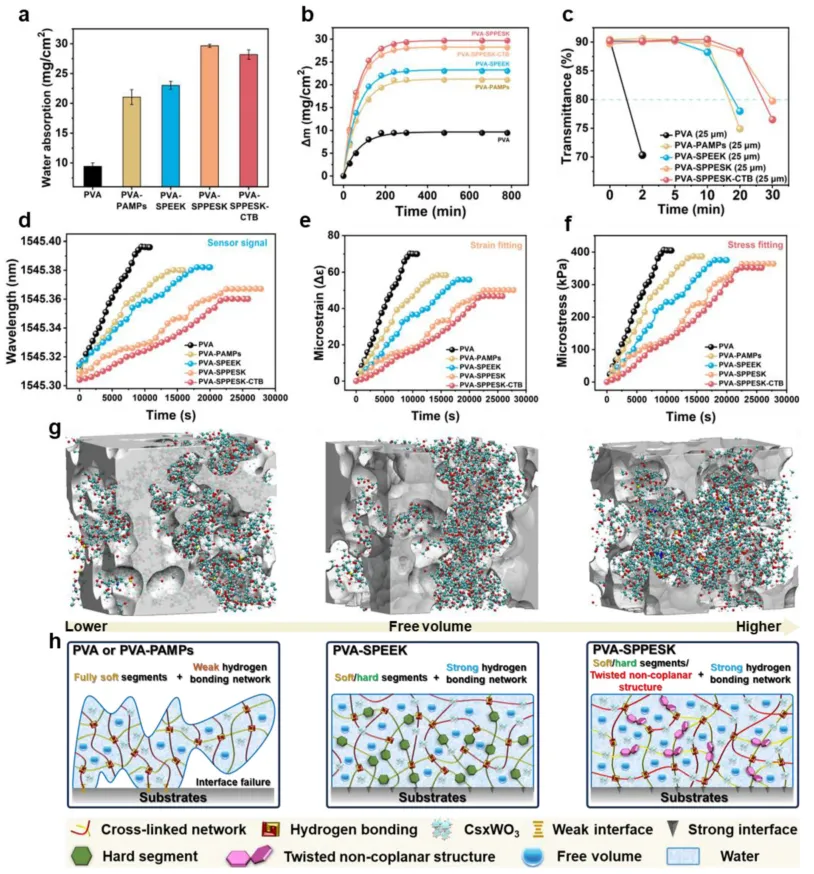 图2 | 防雾机制的探索 a-b.涂层吸湿能力与吸湿动力学的比较。 c. PVA、PVA-PAMPs、PVA-SPEEK、PVA-SPPESK及PVA-SPPESK-CTB涂层在85℃水蒸气下的平均透光率随时间变化。 d–f. 通过光纤光栅测量的体积膨胀信号-应力-应变关系拟合图。 g.PVA-PAMPs、PVA-SPEEK和PVA-SPPESK氢键交联系统的分子动力学模拟。 h. PVA和PVA-PAMPs涂层因附着力弱导致界面失效、起皱甚至破裂;PVA-SPEEK的刚性结构确保稳固锚定;PVA-SPPESK的扭曲非共面结构通过高吸湿率延长防雾时间。