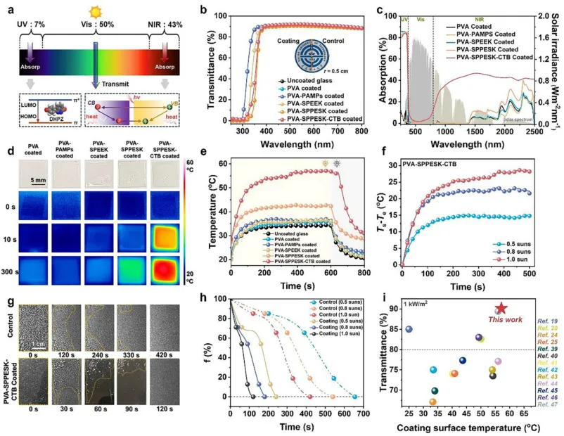 图3 | 光热防/除雾涂层的设计与光学性能 a. 透明涂层的光热机制:紫外与近红外光被吸收并转化为热能,可见光则保持透射。 b. 涂层的透明度测试。 c. 涂层的太阳光吸收光谱,填充部分为AM 1.5全球太阳参考光谱。 d. 红外热成像监测涂层表面温度变化。 e. 各涂层在1太阳辐照下表面温度随时间响应曲线。 f . 在0.5至1.0太阳辐照下表面的平均温升。 g. 在1太阳光照下的定性图像序列,显示PVA-SPPESK-CTB涂层在120秒内完全除雾。 h. 雾分数随时间演变,显示涂层除雾速度快于对照组。 i . 本研究与文献报道的光热涂层在可见光透射率与表面温度方面的比较。