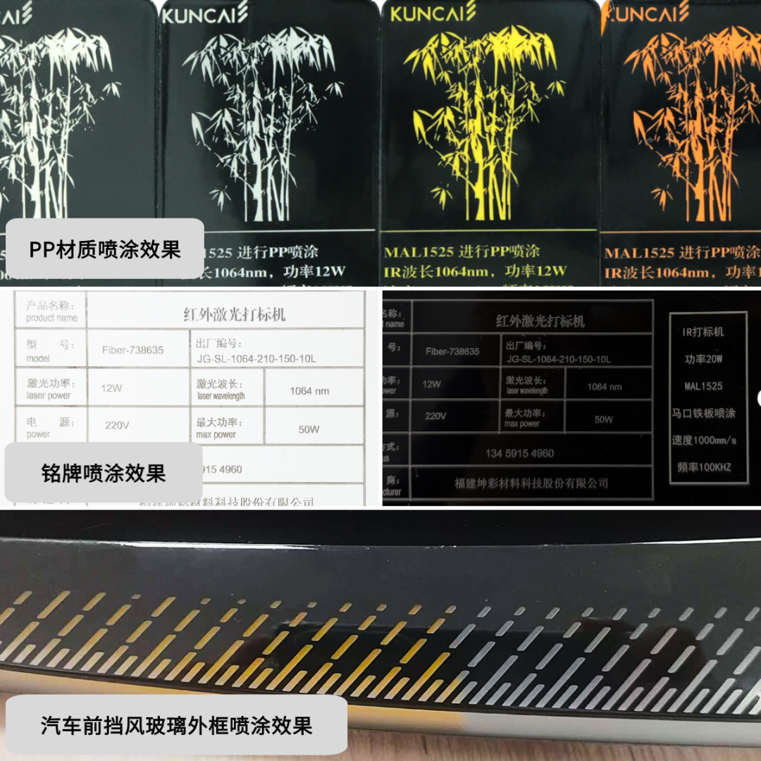 喷涂应用:将粉末加入涂料中,喷涂于金属、塑料等基材表面,形成激光敏感层。适用于平面、曲面及异形结构,标识具备良好的耐摩性能,广泛用于汽车玻璃边框、铭牌等场景。