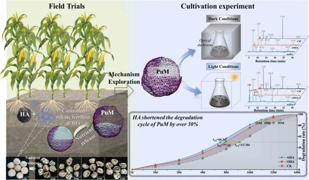 山东农业大学土肥高效利用国家工程研究中心的研究人员提出了一种协同解决方案:腐殖酸与控释肥料的联合使用,不仅能使作物增产12.3%–22.4%,还能够将聚氨酯微塑料降解速率提升34.3%–43.9%,